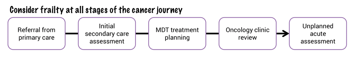 A frailty assessment should be done at every step along the cancer journey in order to inform treatment decisions and ongoing care (Joint Collegiate Council for Oncology 2023).